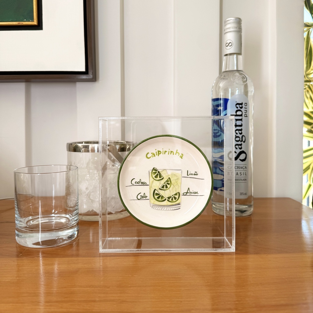 A bebida mais brasileira de todas ganhou sua versão em cerâmica pintada à mão, com receita ilustrada e detalhes em ouro líquido. O prato é protegido pelo acrílico e vira um quadro para decorar o bar ou aquele cantinho que pede um clima tropical.