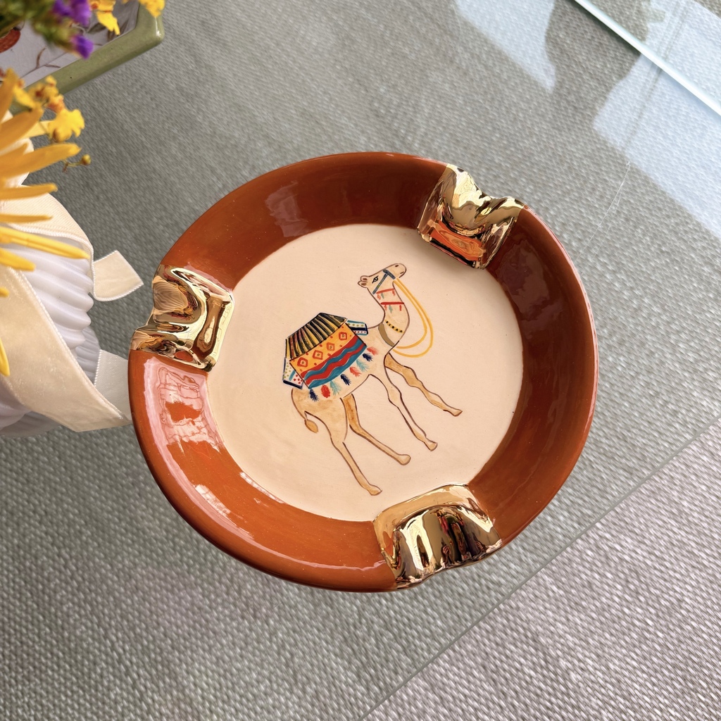 Inspirado nas paisagens áridas e encantadoras do deserto, o Cinzeiro Dunas é uma peça em cerâmica pintada à mão, com ilustração de camelo e bordas esmaltadas em tom terroso. Os apoios são finalizados com detalhes em ouro, trazendo um toque de brilho e sofisticação à rusticidade da peça.